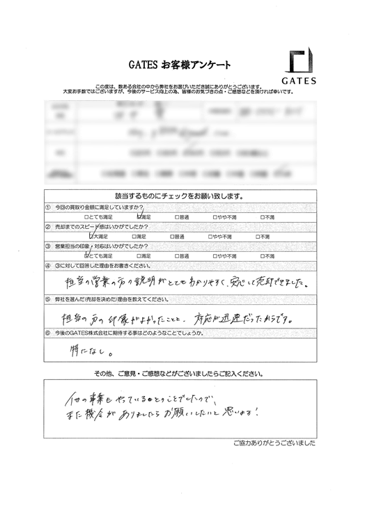 担当の営業の方の説明がとてもわかりやすく、安心して売却できました。